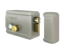 Cerradura de sobreponer con mecanismo eléctrico de doble bobina de 12V y 1.2 A con botón de accionamiento interno incluido en la cerradura y mecanismo de bloqueo del botón con la llave.