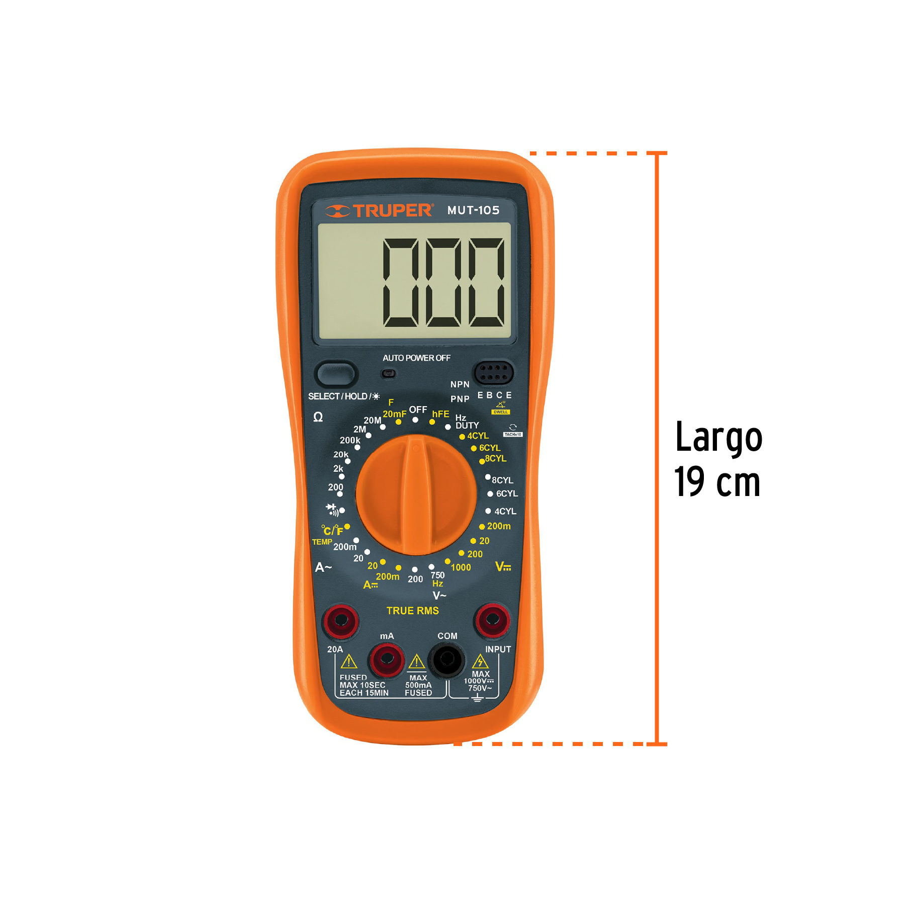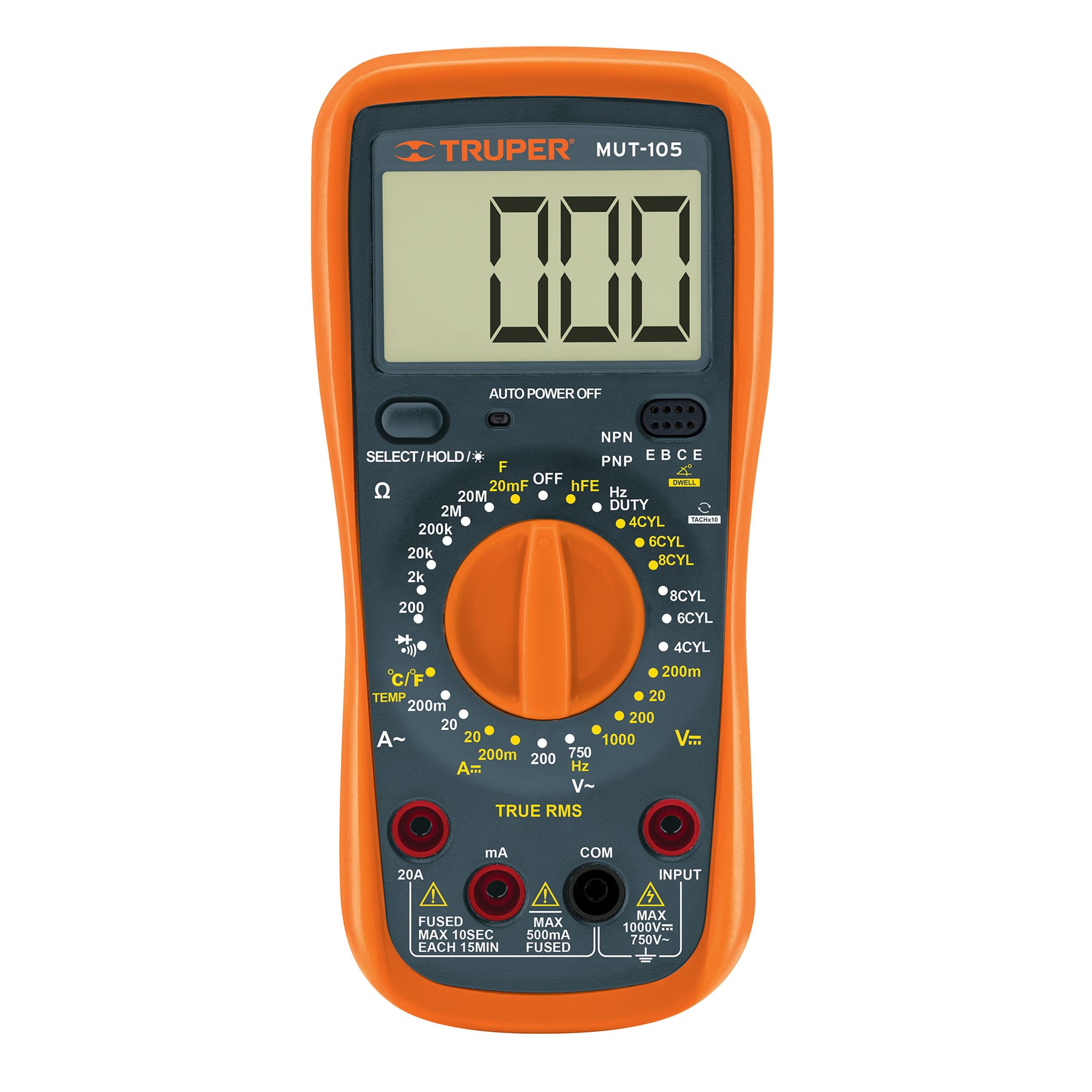 - Funciones: Prueba de continuidad audible, diodo, transistor NPN o PNP (0-1,000 B), Mayor precisión en mediciones de CA (True RMS) y Sistema de auto apagado (APO)